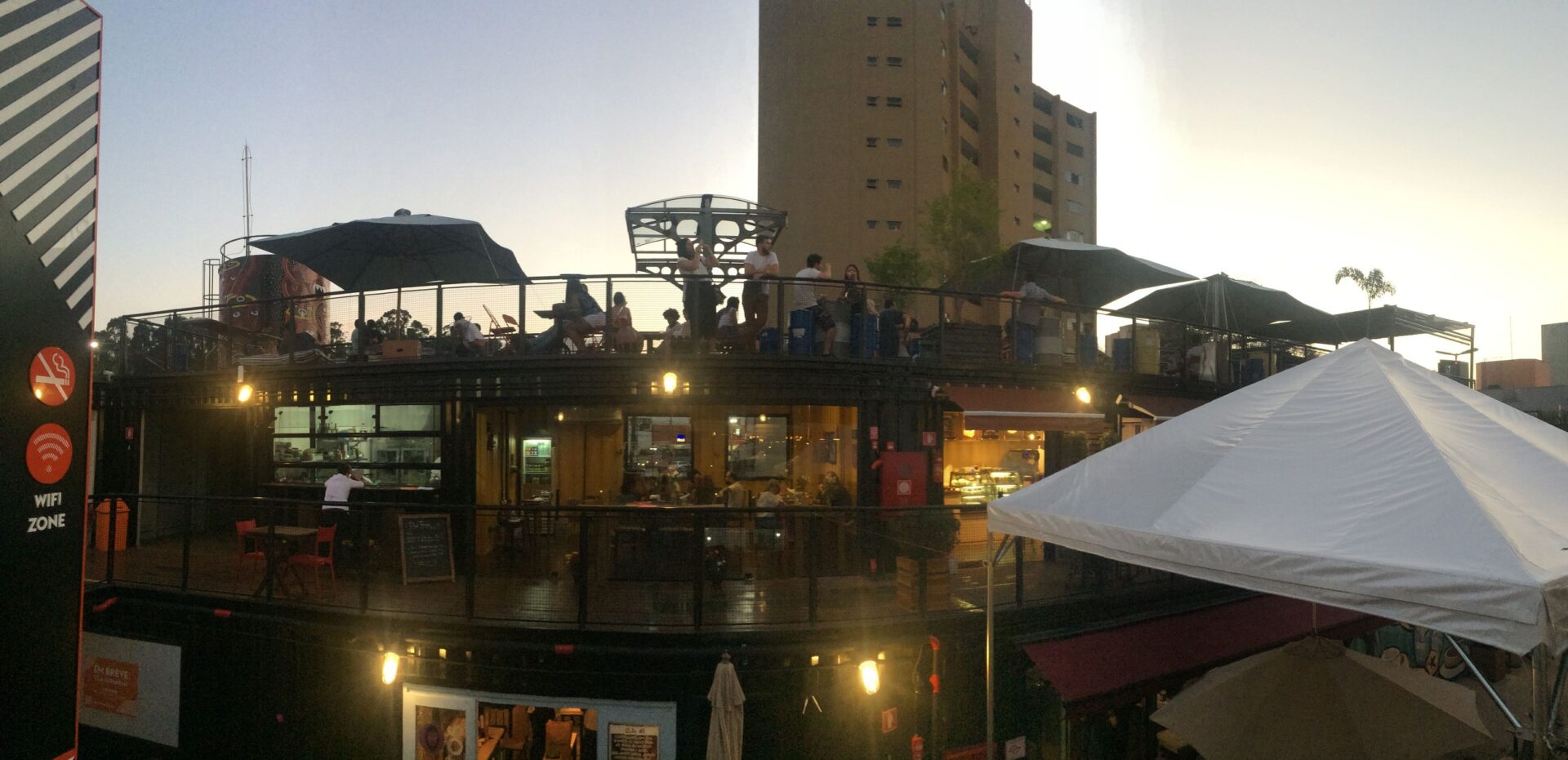 - Com 3 pavimentos, 33 espaços para Lojas, Restaurantes, Roof Top, Food Park, Pátios para convívio e shows, Estacionamento e Apoios. Telhado verde garante o isolamento térmico dos containers.